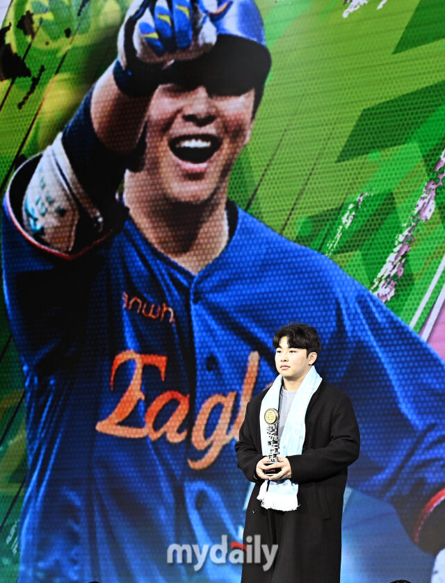 [마이데일리 = 송일섭 기자] 한화 문현빈이 1일 오전 서울 광장동 비스타 워커힐 서울에서 진행된 '2025 리얼글러브 어워드(REAL GLOVE AWARD)'에서 팬스 초이스상을 수상하고 있다.