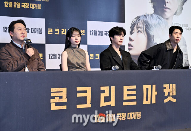 [마이데일리 = 송일섭 기자] 배우 정만식, 이재인, 홍경, 유수빈(왼쪽부터)이 1일 오후 서울 잠실 롯데시네마 월드타워에서 진행된 영화 '콘크리트 마켓' (감독 홍기원, 배급 롯데엔터테인먼트) 언론 시사회 및 간담회에서 이야기를 하고 있다.