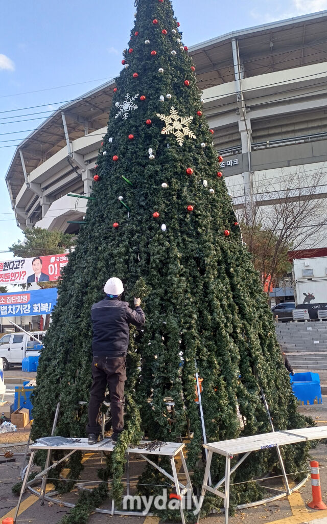 [마이데일리 = 수원 유진형 기자] 2일 오후 경기도 수원시 장안구청 사거리에 대형 크리스마스 트리가 설치되고 있다.