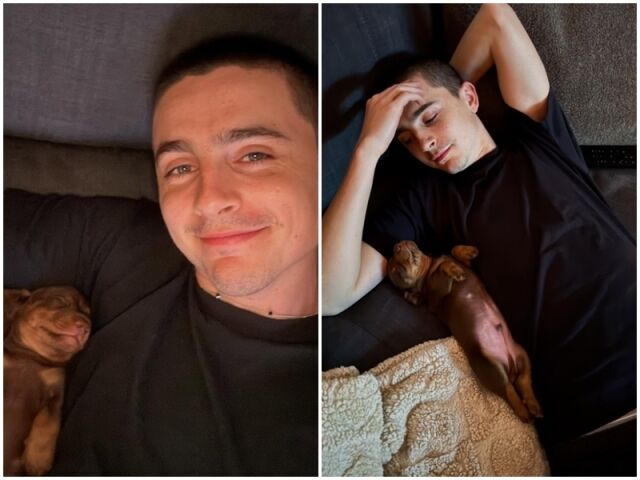 사진 속 샬라메는 반려견과 함께 침대에 누워 셀카를 찍고 있다.
