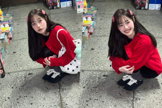 특히 빨간 가디건과 양갈래 헤어핀으로 포인트를 준 스타일링은 겨울 분위기 속에서도 발랄함을 잃지 않는 츄만의 ‘비타민 룩’을 완성했다. 블랙 원피스와 도트 패턴 가방까지 더해지며 마치 애니메이션 속에서 막 튀어나온 듯한 ‘만화 캐릭터’ 같은 귀여움이 돋보였다.