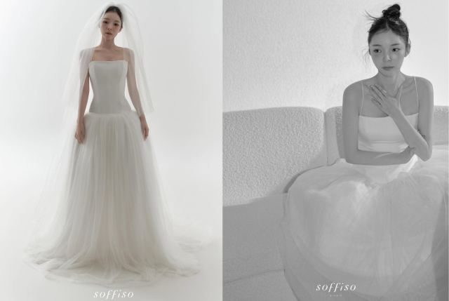 공개된 사진 속 박진주는 실크 톱과 튤 스커트가 어우러진 웨딩드레스를 입고 청순하면서도 우아한 분위기를 자아냈다. 자연스럽게 올린 헤어 스타일과 담담한 표정이 조화를 이루며 신부 특유의 순수한 매력을 극대화했다. 또 다른 컷에서는 깊게 파인 라인의 드레스를 입고 성숙한 아름다움을 드러내며 영화의 한 장면 같은 분위기를 완성했다.