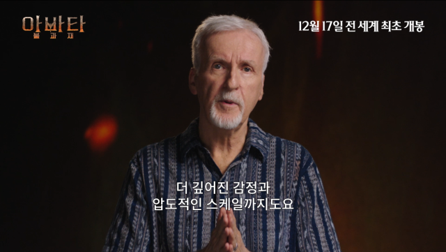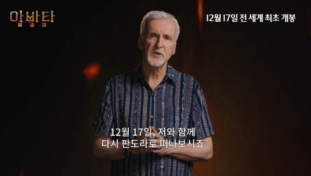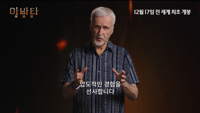 [마이데일리 = 강다윤 기자] 개봉 10일 전, 전체 예매율 1위 등극과 함께 35%가 넘는 예매율(12월 8일 기준)을 자랑하며 연말 극장가 최고의 화제작으로 우뚝 선 영화 '아바타: 불과 재'의 제임스 카메론 감독이 작품 개봉을 앞두고 관객들에게 감사 인사를 전해 눈길을 사로잡는다.