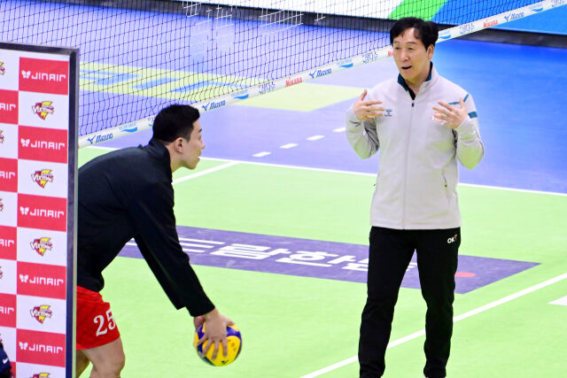 OK저축은행 신영철 감독이 지난 5일 경기도 수원체육관에서 진행된 '진에어 2025~2026 V리그' 한국전력-OK저축은행의 경기 전 훈련을 하고 있는 한국전력 신영석에게 토스를 해주고 있다. 신영철 감독과 신영석은 2007년 국가대표 코치와 선수로 만난 인연이 있다.