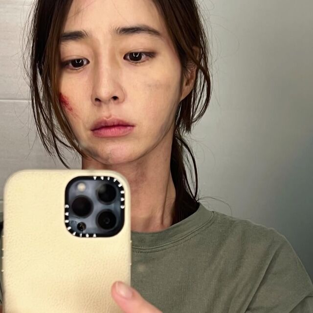 공개된 사진 속 이민정은 거울 앞에서 셀카를 찍고 있다. 얼굴에는 피가 묻은 상처와 멍 자국 분장이 가득해 극 중 치열한 상황을 짐작하게 했다. 화장기 없는 얼굴과 다소 지친 표정임에도 불구하고 특유의 또렷한 이목구비는 시선을 사로잡았다.