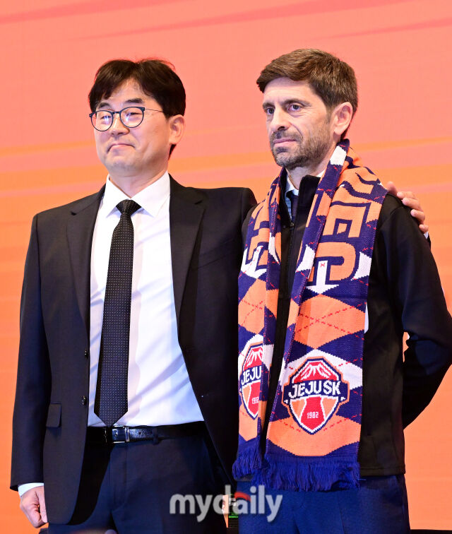[마이데일리 = 곽경훈 기자] 세르지우 코스타(52·포르투갈) 감독이 29일 오전 서울 메이필드호텔에서 진행된 프로축구 K리그1 제주SK 감독 취임 기자회견에서 조자룡 단장과 함께 포즈를 취하고 있다.