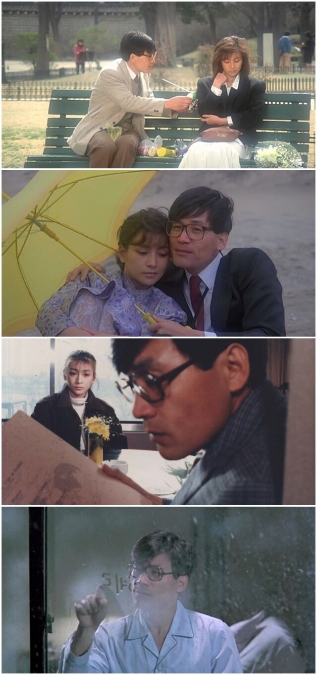 이 영화의 흥미로운 점 중 하나는 영민과 혜린의 제대로 된 '데이트 장면'이 없다는 것이다. 영민은 덕수궁 석조전에서 혜린을 만나 삶은 달걀과 사이다를 건네며 데이트를 꿈꾸지만, 혜린은 다시는 연락하지 말라는 말을 남긴 채 떠난다. 처음이자 마지막이 될 뻔한 데이트는 그렇게 끝났다. 그러나 혜린을 위해 달걀 껍데기를 정성껏 까고, 캔 사이다를 조심스럽게 따는 영민의 모습에는 멜로 특유의 두근거림이 살아 숨 쉰다. 흔하디 흔한 데이트 장면 없이도 영화는 영민의 지고지순한 사랑을 로맨틱하게 그려냈다. 특히 두꺼운 뿔테 안경을 쓴 안성기는 어수룩하면서도 뚝심 있는 짝사랑의 전형을 탁월하게 연기하며 작품의 품격을 높였다.