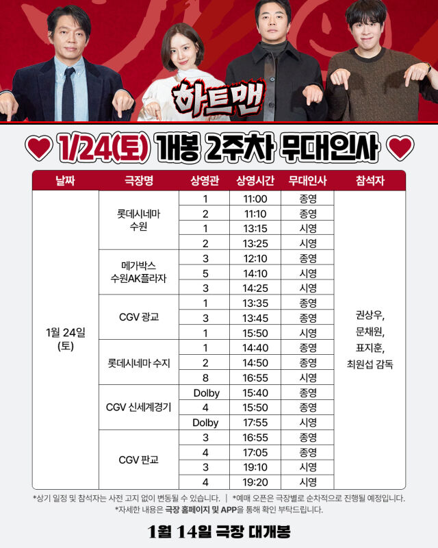 [마이데일리 = 강다윤 기자] 2026년 새해 극장가에 유쾌한 에너지와 웃음을 전할 영화 '하트맨'이 개봉 2주 차 주말 무대인사를 추가 확정했다.