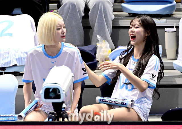 [마이데일리 = 인천 유진형 기자] 대한항공 서현숙 치어리더와 주예지 치어리더가 1일 인천 계양체육관에서 열린 '진에어 2025-2026 V리그' 대한항공과 삼성화재의 경기에서 이야기를 나누고 있다.
