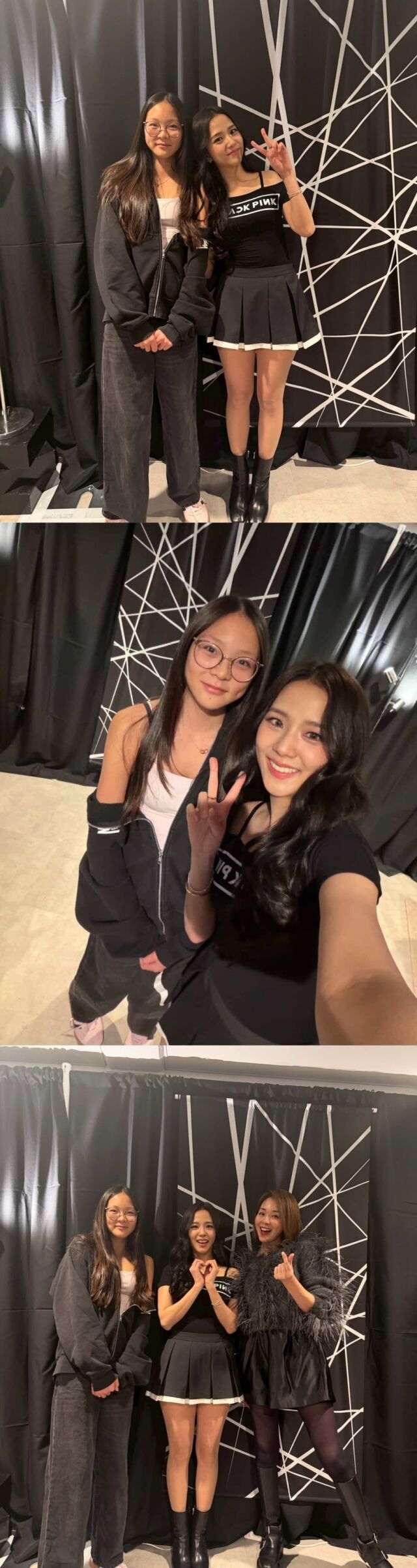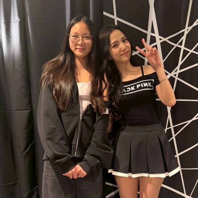 공개된 사진에는 추사랑이 콘서트 백스테이지에서 지수와 나란히 서서 포즈를 취한 모습이 담겼다. 편안한 차림의 추사랑과 무대 의상을 입은 지수의 스타일링이 대비를 이루는 가운데, 무엇보다 시선을 끈 것은 두 사람의 뚜렷한 키 차이였다.