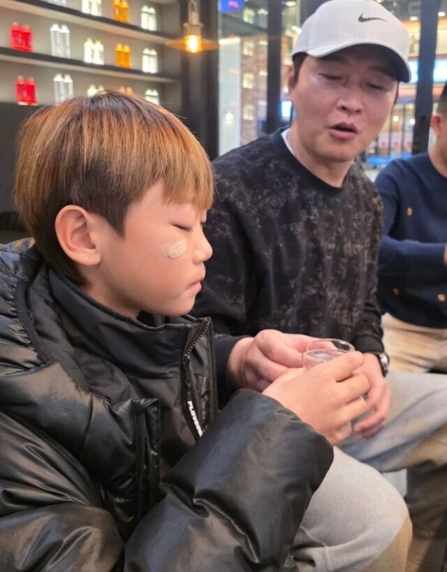 공개된 사진에는 이동국이 아들 시안 군에게 보리차를 건네는 다정한 부자(父子)의 모습이 담겼다. 그러나 시안 군의 볼에 붙은 반창고가 함께 포착돼 보는 이들의 시선을 끌었다.