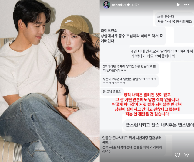 곽민선은 21일 자신의 SNS를 통해 실제로 받은 다수의 DM 내용을 공개했다. 공개된 메시지에는 "소름 돋는다", "서울 가서 XX되라", "와이프인 죄로 뒤통수 조심해라" 등 차마 옮기기 힘든 협박성·비난성 문구들이 담겨 있어 충격을 안겼다.