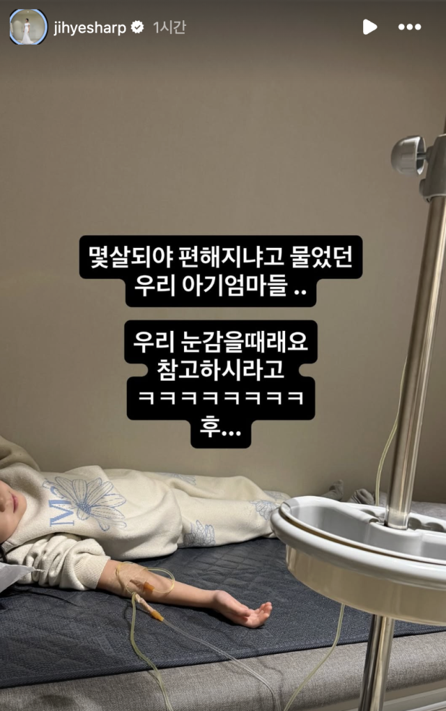 이지혜는 23일 자신의 SNS를 통해 링거를 맞고 있는 딸의 모습을 공개했다. 사진과 함께 그는 "몇 살이 되면 좀 편해지냐고 묻던 아기 엄마들… 우리 눈 감을 때래요. 참고하시라고요. 후…"라는 글을 남기며 깊은 한숨을 내쉬었다.
