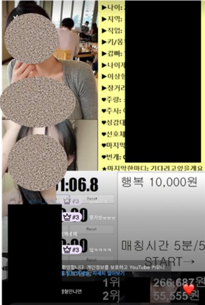 화면에는 노출이 심한 여성의 사진과 함께 나이, 키, 거주지, 심지어는 성감대와 같은 노골적인 성적 취향까지 공개됐다. 시청자들은 BJ의 계좌로 실시간 송금을 하며 순위 다툼을 벌였고, 한 참여자가 2만 원을 보내자 BJ는 “현재 선두”라며 입찰을 독려했다. 결국 15만 원을 낸 시청자가 최종 낙찰자가 되어 여성의 연락처를 획득했다.