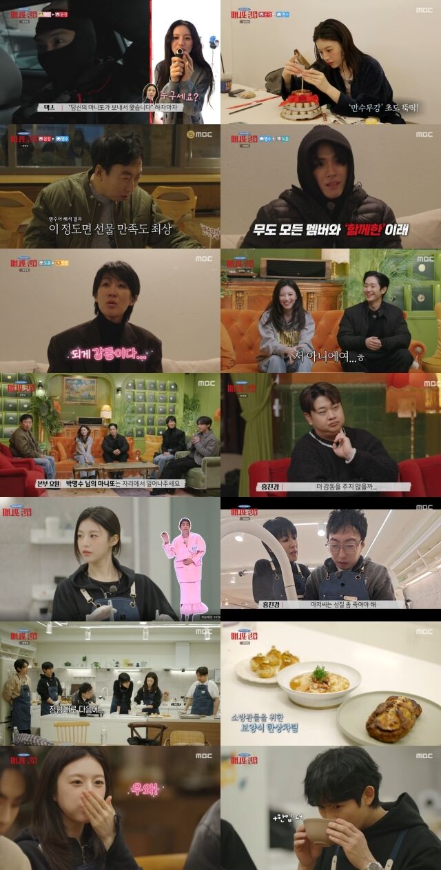 메뉴로는 몸보신용 해신 칼국수와 전복 떡갈비, 그리고 '마니또표 두쫀쿠'인 두쫀슈를 만들기로 뜻을 모았다. 윤남노 셰프와 홍진경이 장을 보러 나간 사이, 박명수, 고윤정, 김도훈은 요리 준비에 나서며 케미를 뽐냈다. 박명수의 주도로 시작된 예능 교실 속에서 고윤정과 김도훈 두 예능 새내기의 활약도 눈길을 끌었다. 고윤정은 랄랄 부캐 '이명화' 성대모사는 물론 댄스 실력까지 뽐내며 박명수를 흡족하게 했고, 지드래곤 모창을 선사한 김도훈의 뜻밖의 활약도 폭소를 안겼다.